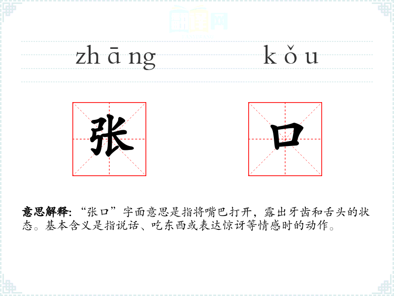 “张口”字面意思是指将嘴巴打开,露出牙齿和舌头的状态。基本含义是指说话、吃东西或表达惊讶等情感时的动作。