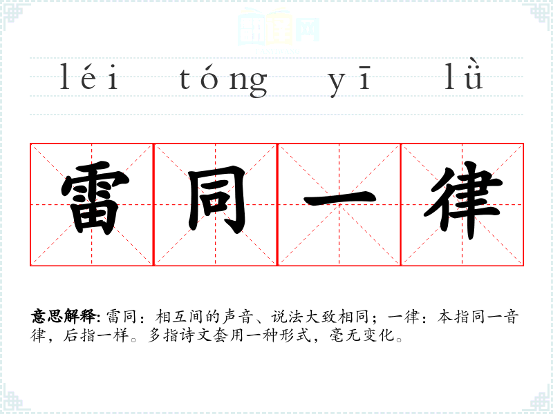雷同:相互间的声音、说法大致相同;一律:本指同一音律,后指一样。多指诗文套用一种形式,毫无变化。