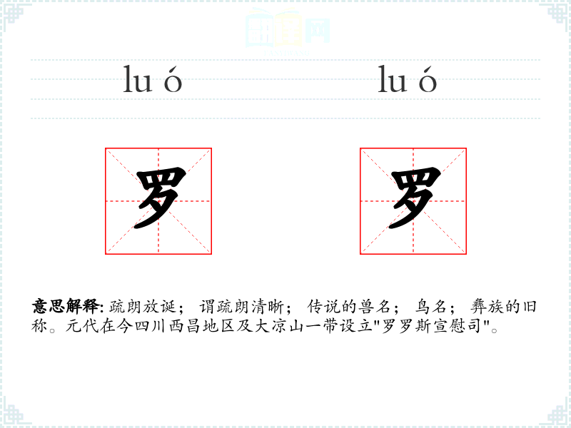 疏朗放诞; 谓疏朗清晰; 传说的兽名; 鸟名; 彝族的旧称。元代在今四川西昌地区及大凉山一带设立"罗罗斯宣慰司"。