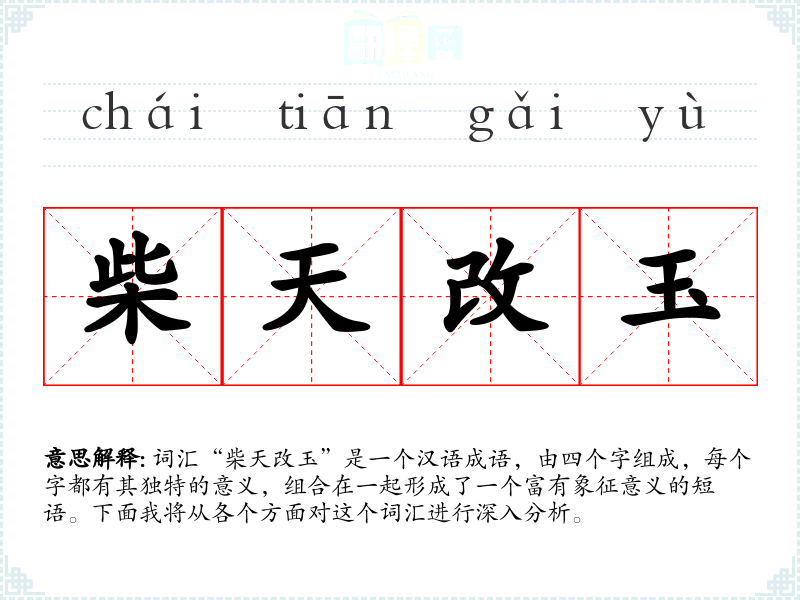 词汇“柴天改玉”是一个汉语成语,由四个字组成,每个字都有其独特的意义,组合在一起形成了一个富有象征意义的短语。下面我将从各个方面对这个词汇进行深入分析。