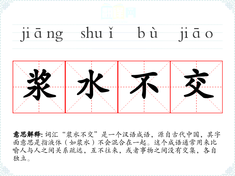 “浆水不交”字面意思是两种液体不会混合,比喻人与人或事物之间没有交集,关系疏远。