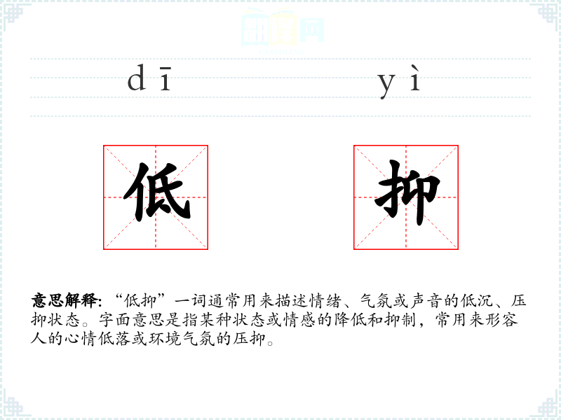 - 文学:在文学作品中,“低抑”常用来形容人物的内心世界,如“他的心情低抑,仿佛被重重的阴云笼罩。”