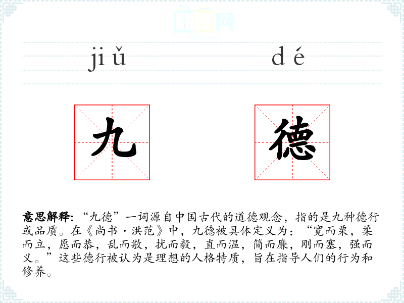 “九德”的词源可以追溯到《尚书·洪范》,这是古代的一部重要典籍。随着时间的推移,九德的概念在文化中被广泛接受和传承,成为衡量个人品德的重要标准。