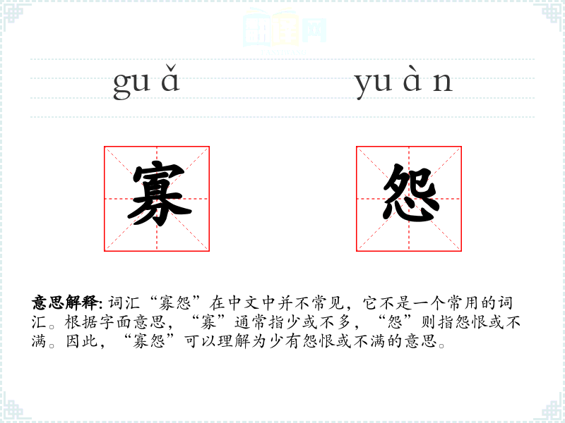 词汇“寡怨”在中文中并不常见,它不是一个常用的词汇。根据字面意思,“寡”通常指少或不多,“怨”则指怨恨或不满。因此,“寡怨”可以理解为少有怨恨或不满的意思。