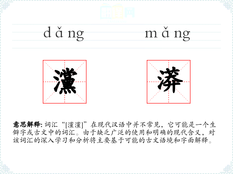 词汇“[灙灙]”在现代汉语中并不常见,它可能是一个生僻字或古文中的词汇。由于缺乏广泛的使用和明确的现代含义,对该词汇的深入学习和分析将主要基于可能的古文语境和字面解释。