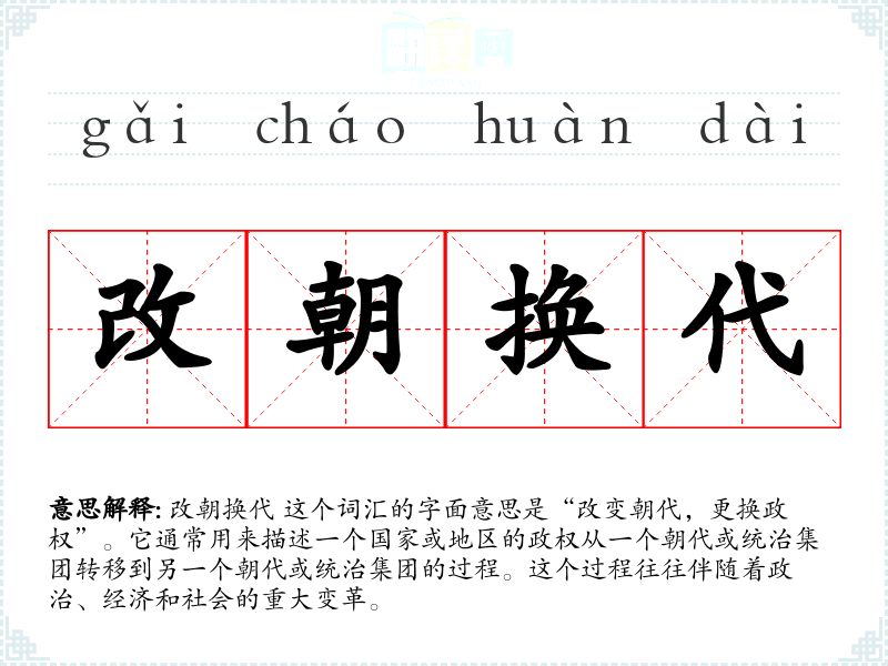 改朝换代 这个词汇的字面意思是“改变朝代,更换政权”。它通常用来描述一个国家或地区的政权从一个朝代或统治集团转移到另一个朝代或统治集团的过程。这个过程往往伴随着政治、经济和社会的重大变革。
