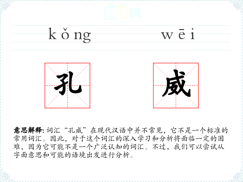 结合这两个字,“孔威”可能指的是一种通过小洞或空隙展现出的力量或威严,或者与孔子家族相关的威严。