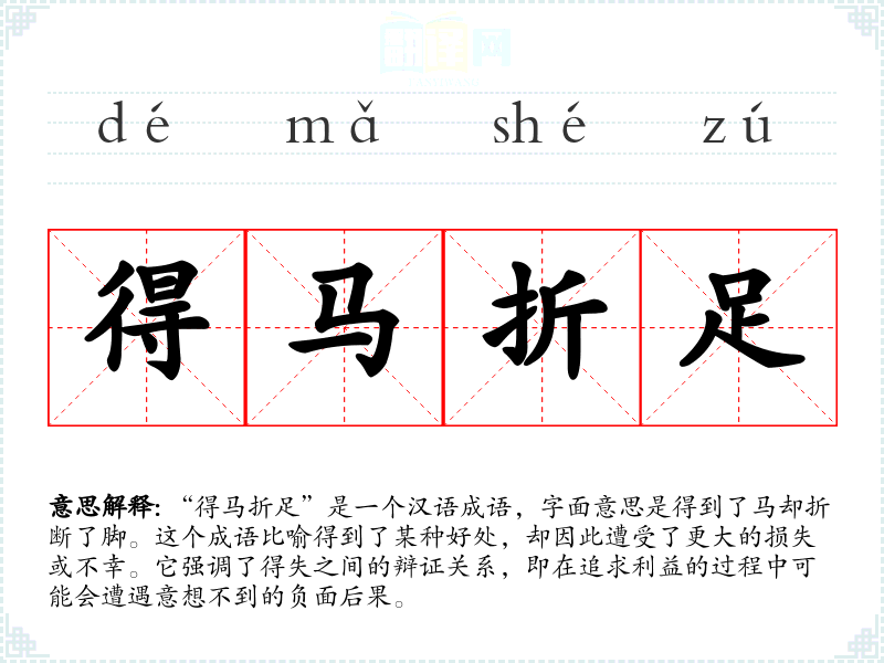 “得马折足”是一个汉语成语,字面意思是得到了马却折断了脚。这个成语比喻得到了某种好处,却因此遭受了更大的损失或不幸。它强调了得失之间的辩证关系,即在追求利益的过程中可能会遭遇意想不到的负面后果。