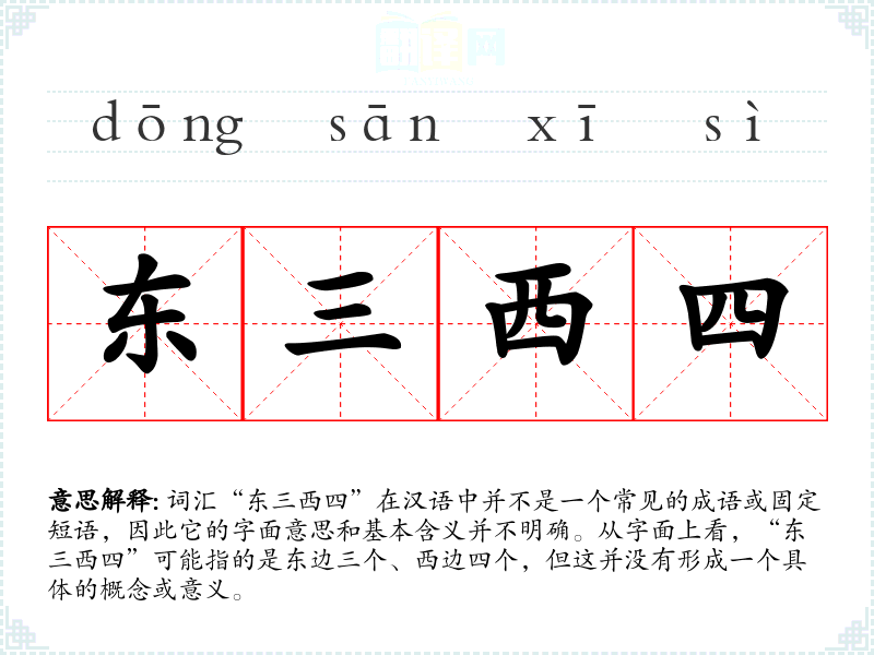 “东三西四”作为一个不常见的词汇,其使用和理解需要具体的语境。在语言学习和表达中,了解和掌握常用词汇更为重要。对于这类不常见的词汇,了解其可能的语境和用法,有助于丰富语言知识。