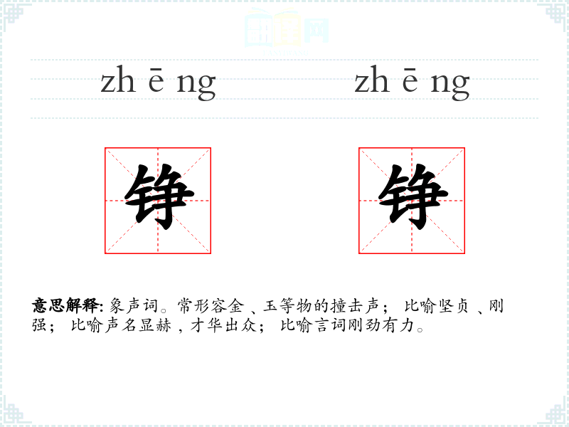 象声词。常形容金﹑玉等物的撞击声; 比喻坚贞﹑刚强; 比喻声名显赫﹐才华出众; 比喻言词刚劲有力。