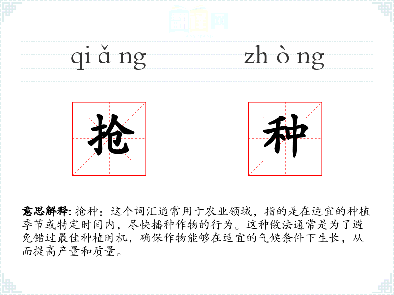 抢种:这个词汇通常用于农业领域,指的是在适宜的种植季节或特定时间内,尽快播种作物的行为。这种做法通常是为了避免错过最佳种植时机,确保作物能够在适宜的气候条件下生长,从而提高产量和质量。