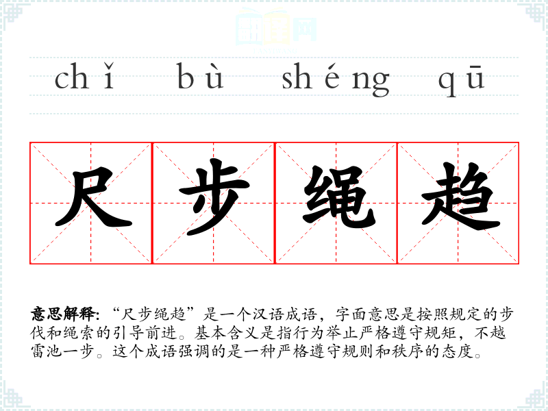 “尺步绳趋”是一个汉语成语,字面意思是按照规定的步伐和绳索的引导前进。基本含义是指行为举止严格遵守规矩,不越雷池一步。这个成语强调的是一种严格遵守规则和秩序的态度。