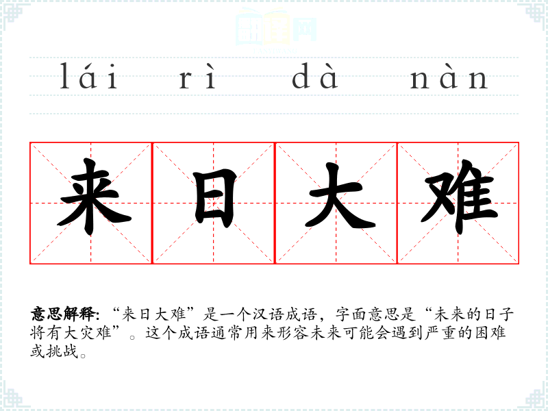 “来日大难”是一个汉语成语,字面意思是“未来的日子将有大灾难”。这个成语通常用来形容未来可能会遇到严重的困难或挑战。