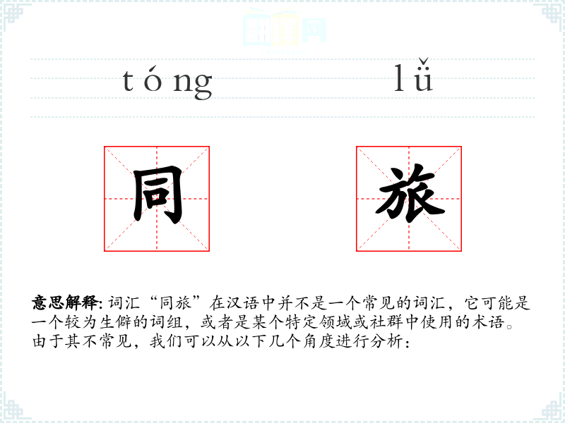 词汇“同旅”在汉语中并不是一个常见的词汇,它可能是一个较为生僻的词组,或者是某个特定领域或社群中使用的术语。由于其不常见,我们可以从以下几个角度进行分析: