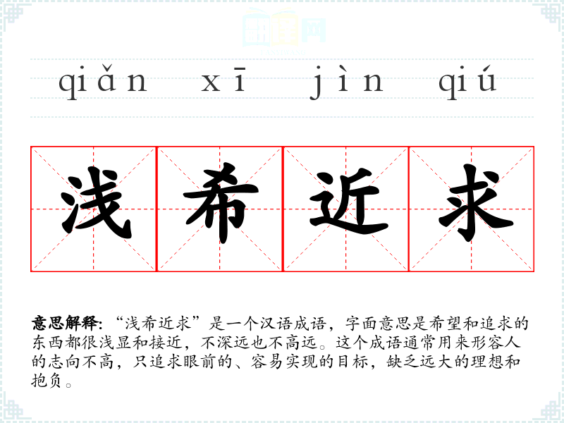 “浅希近求”是一个汉语成语,字面意思是希望和追求的东西都很浅显和接近,不深远也不高远。这个成语通常用来形容人的志向不高,只追求眼前的、容易实现的目标,缺乏远大的理想和抱负。