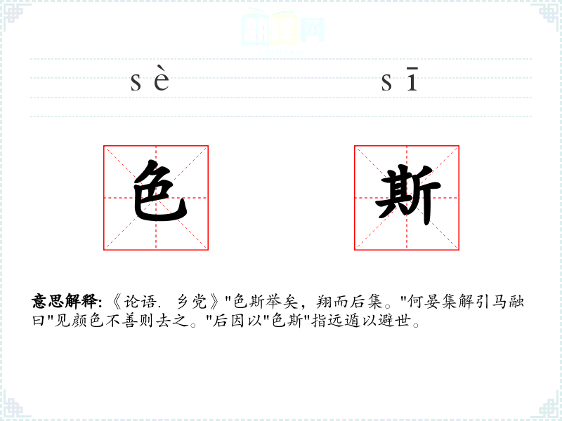《论语.乡党》"色斯举矣,翔而后集。"何晏集解引马融曰"见颜色不善则去之。"后因以"色斯"指远遁以避世。
