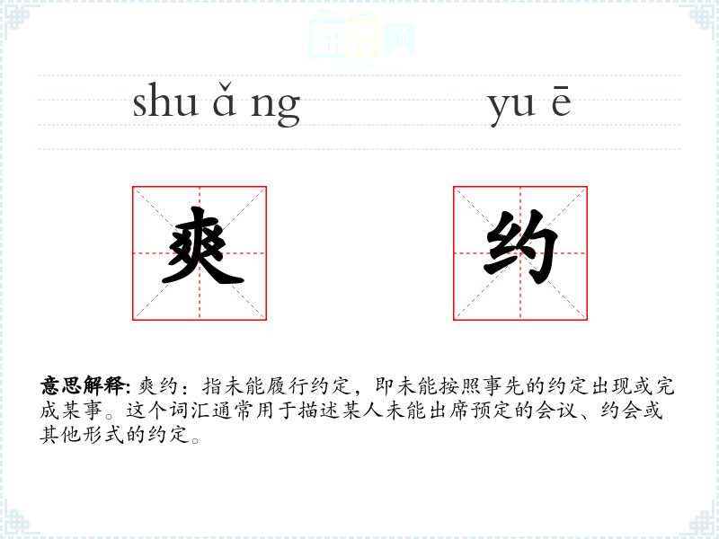 爽约:指未能履行约定,即未能按照事先的约定出现或完成某事。这个词汇通常用于描述某人未能出席预定的会议、约会或其他形式的约定。
