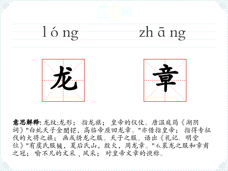 1.龙纹;龙形; 指龙旗; 皇帝的仪仗。唐温庭筠《湖阴词》"白虬天子金閎铓,高临帝座回龙章。"亦借指皇帝; 指得专征伐的大将之旗; 画或绣龙之服。天子之服。语出《礼记.明堂位》"有虞氏服韨,夏后氏山,殷火,周龙章。" 6.衮龙之服和章甫之冠; 喻不凡的文采﹑风采; 对皇帝文章的谀称。