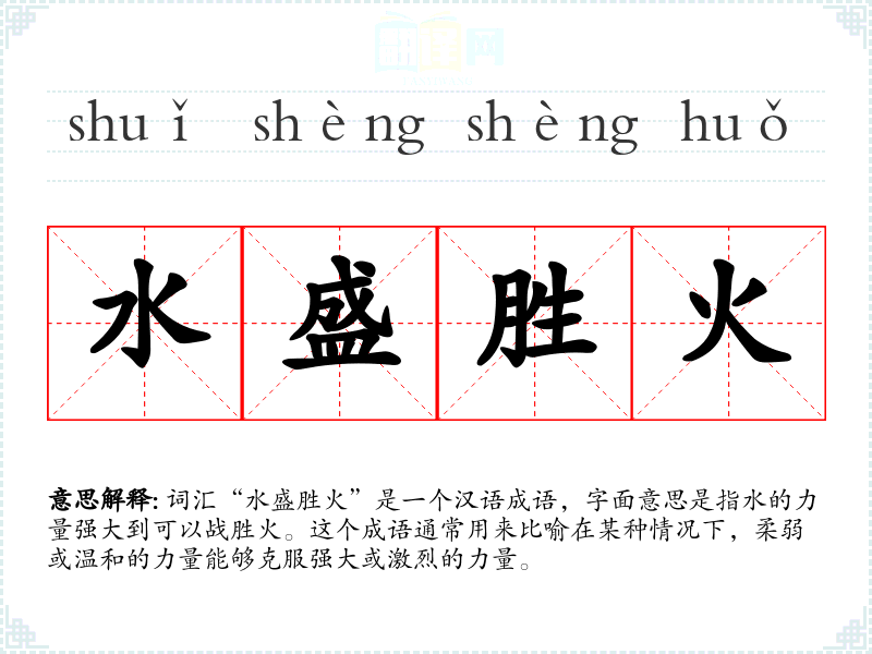 词汇“水盛胜火”是一个汉语成语,字面意思是指水的力量强大到可以战胜火。这个成语通常用来比喻在某种情况下,柔弱或温和的力量能够克服强大或激烈的力量。
