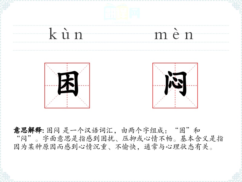 困闷 是一个汉语词汇,由两个字组成:“困”和“闷”。字面意思是指感到困扰、压抑或心情不畅。基本含义是指因为某种原因而感到心情沉重、不愉快,通常与心理状态有关。