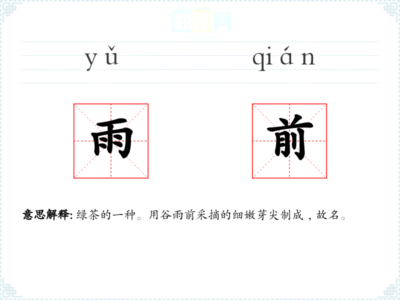 绿茶的一种。用谷雨前采摘的细嫩芽尖制成﹐故名。
