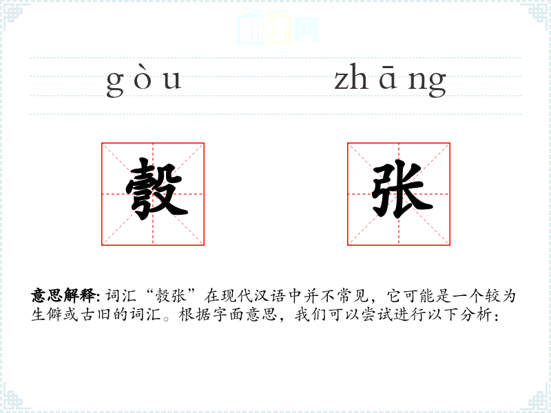 词汇“彀张”在现代汉语中并不常见,它可能是一个较为生僻或古旧的词汇。根据字面意思,我们可以尝试进行以下分析: