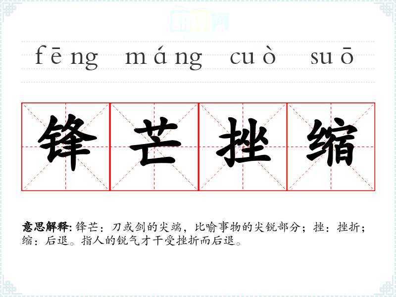 锋芒:刀或剑的尖端,比喻事物的尖锐部分;挫:挫折;缩:后退。指人的锐气才干受挫折而后退。