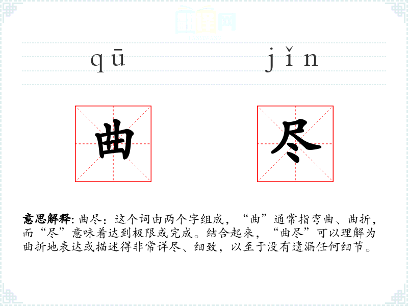 曲尽:这个词由两个字组成,“曲”通常指弯曲、曲折,而“尽”意味着达到极限或完成。结合起来,“曲尽”可以理解为曲折地表达或描述得非常详尽、细致,以至于没有遗漏任何细节。