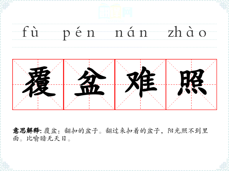覆盆:翻扣的盆子。翻过来扣着的盆子,阳光照不到里面。比喻