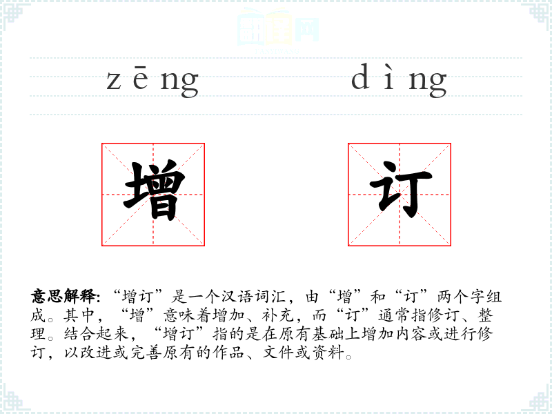 “增订”是一个汉语词汇,由“增”和“订”两个字组成。其中,“增”意味着增加、补充,而“订”通常指修订、整理。结合起来,“增订”指的是在原有基础上增加内容或进行修订,以改进或完善原有的作品、文件或资料。