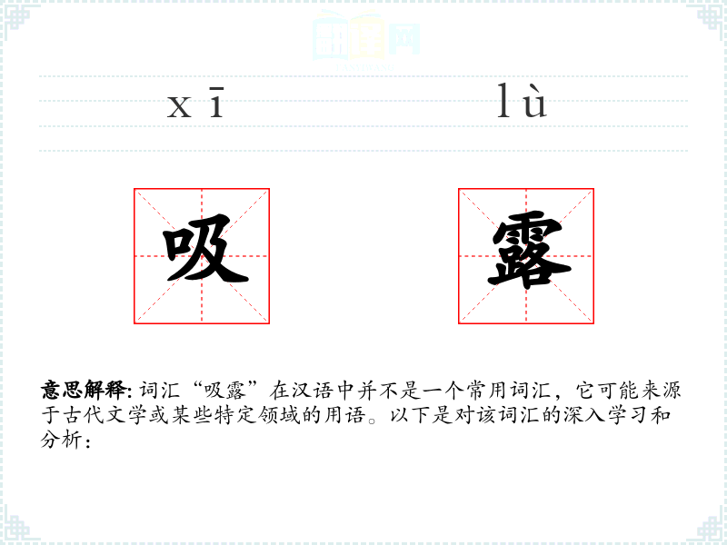 词汇“吸露”在汉语中并不是一个常用词汇,它可能来源于古代文学或某些特定领域的用语。以下是对该词汇的深入学*和分析: