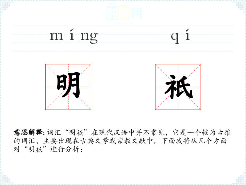 词汇“明祇”在现代汉语中并不常见,它是一个较为古雅的词汇,主要出现在古典文学或**文献中。下面我将从几个方面对“明祇”进行分析: