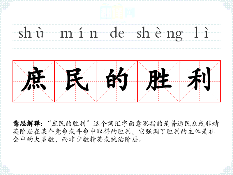 “庶民的胜利”这个词汇字面意思指的是普通民众或非精英阶层在某个竞争或斗争中取得的胜利。它强调了胜利的主体是社会中的大多数,而非少数精英或统治阶层。