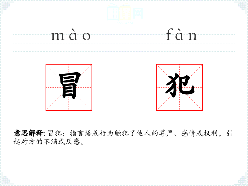 冒犯:指言语或行为触犯了他人的尊严、感情或权利,引起对方的不满或反感。