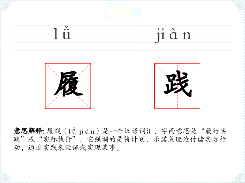 履践(lǚ jiàn)是一个汉语词汇,字面意思是“履行实践”或“实际执行”。它强调的是将计划、承诺或理论付诸实际行动,通过实践来验证或实现某事。