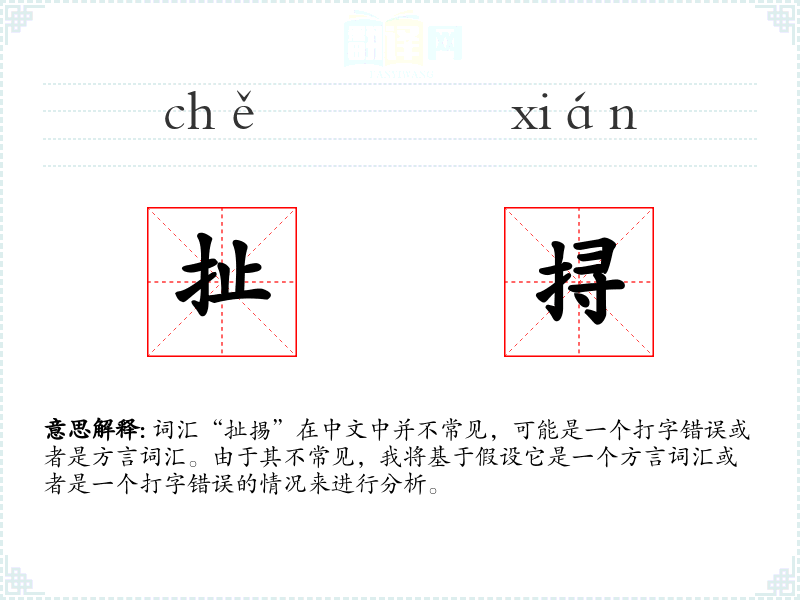 词汇“扯掦”在中文中并不常见,可能是一个打字错误或者是方言词汇。由于其不常见,我将基于假设它是一个方言词汇或者是一个打字错误的情况来进行分析。