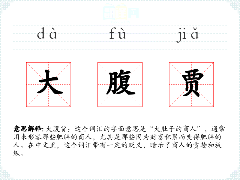 大腹贾:这个词汇的字面意思是“大肚子的商人”,通常用来形容那些肥胖的商人,尤其是那些因为财富积累而变得肥胖的人。在中文里,这个词汇带有一定的贬义,暗示了商人的贪婪和放纵。