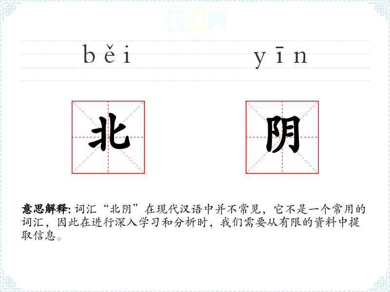 词汇“北阴”在现代汉语中并不常见,它不是一个常用的词汇,因此在进行深入学*和分析时,我们需要从有限的资料中提取信息。