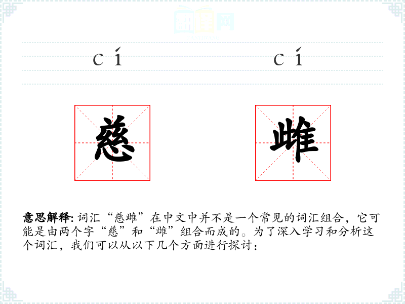 词汇“慈雌”在中文中并不是一个常见的词汇组合,它可能是由两个字“慈”和“雌”组合而成的。为了深入学*和分析这个词汇,我们可以从以下几个方面进行探讨: