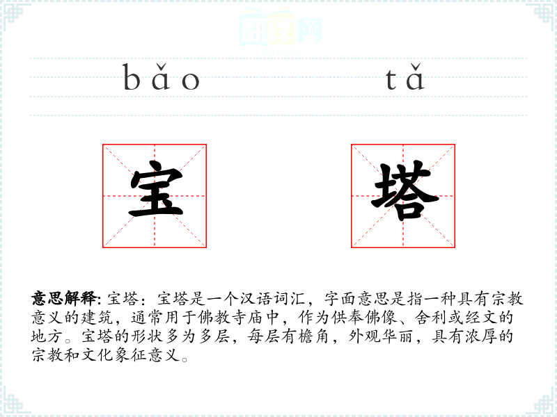 理解:宝塔不仅是一种建筑,更是文化和的象征,承载着丰富的历史和情感。 重要性*:在语言学和表达中,理解和运用宝塔这一词汇,有助于深入了解和体验文化及其背景。