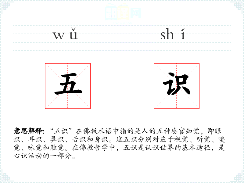 “五识”源自经典,随着的传播,这一概念也被引入到汉语中。在古代汉语中,五识的概念与中医的五行理论有一定的关联,但随着时间的推移,五识主要在**语境中使用。