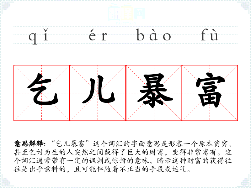 “乞儿暴富”这个词汇的字面意思是形容一个原本贫穷、甚至乞讨为生的人突然之间获得了巨大的财富,变得非常富有。这个词汇通常带有一定的讽刺或惊讶的意味,暗示这种财富的获得往往是出乎意料的,且可能伴随着不正当的手段或运气。
