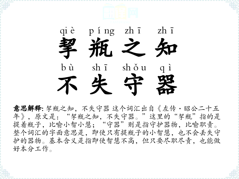 挈瓶之知,不失守器 这个词汇出自《左传·昭公二十五年》,原文是:“挈瓶之知,不失守器。”这里的“挈瓶”指的是提着瓶子,比喻小智小慧;“守器”则是指守护器物,比喻职责。整个词汇的字面意思是,即使只有提瓶子的小智慧,也不会丢失守护的器物。基本含义是指即使智慧不高,但只要尽职尽责,也能做好本分工作。
