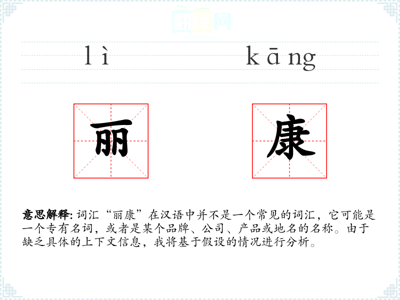 词汇“丽康”在汉语中并不是一个常见的词汇,它可能是一个专有名词,或者是某个品牌、公司、产品或地名的名称。由于缺乏具体的上下文信息,我将基于假设的情况进行分析。