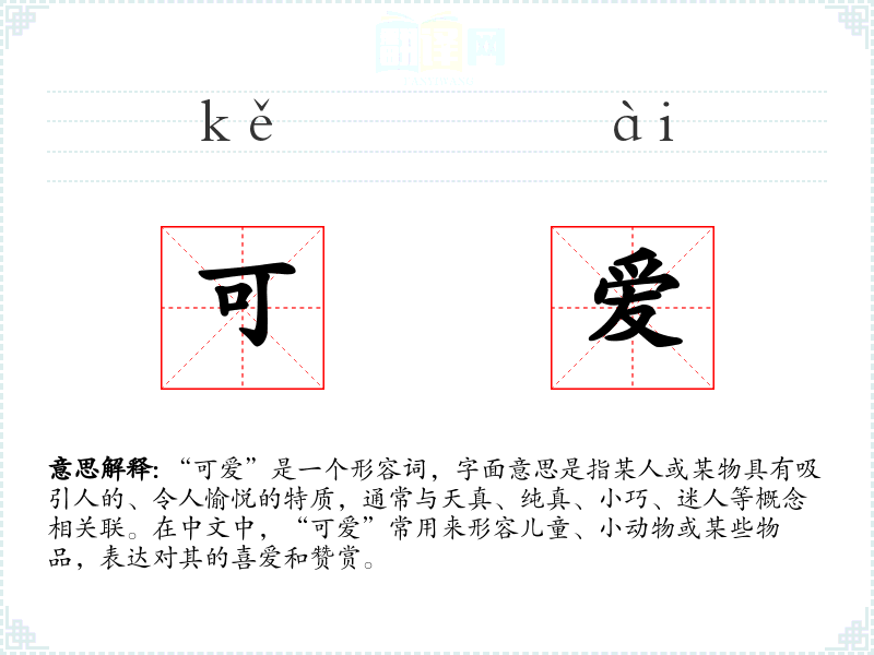 “可爱”是一个形容词,字面意思是指某人或某物具有吸引人的、令人愉悦的特质,通常与天真、纯真、小巧、迷人等概念相关联。在中文中,“可爱”常用来形容儿童、小动物或某些物品,表达对其的喜爱和赞赏。