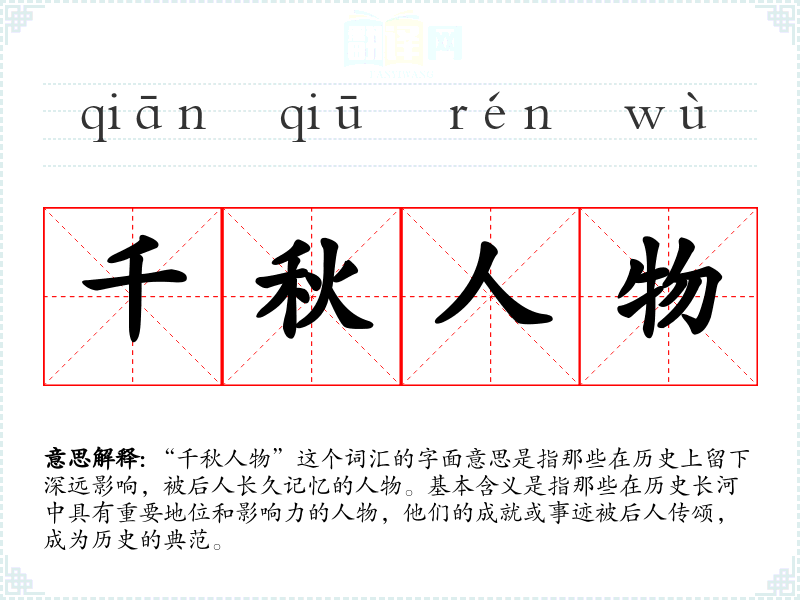 “千秋”一词源自**古代,意指千年,象征时间的长久。“人物”则指有特定品质或成就的人。这个词汇在古代文献中已有使用,随着时间的推移,其含义和用法逐渐固定,成为描述历史重要人物的常用词汇。