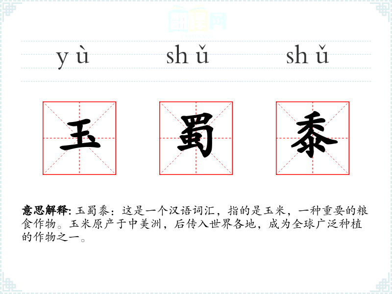 玉蜀黍:这是一个汉语词汇,指的是玉米,一种重要的粮食作物。玉米原产于中美洲,后传入世界各地,成为全球广泛种植的作物之一。