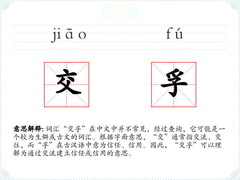 - 词源:“交”和“孚”都是古汉语词汇,“交”源自交际、交流,“孚”源自信任、信用。