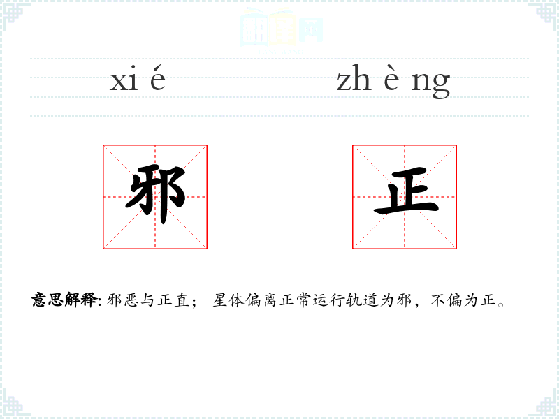 邪恶与正直; 星体偏离正常运行轨道为邪,不偏为正。