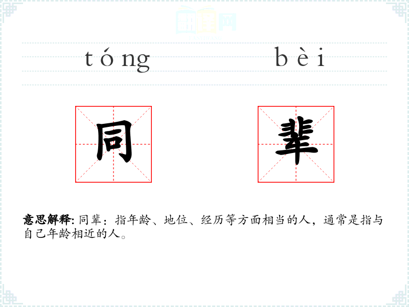 - 词源:同辈一词源于汉语,由“同”和“辈”两个字组成,意为同一辈分的人。